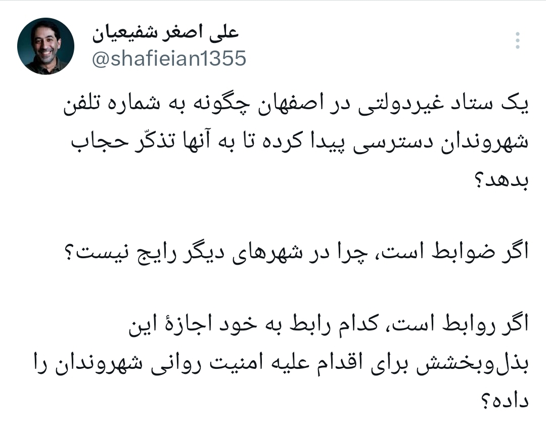 شفیعیان در توییتش از دسترسی ستادی غیردولتی به شمارههای شهروندان برای تذکر حجاب گفته و آن را نقد کرده است.