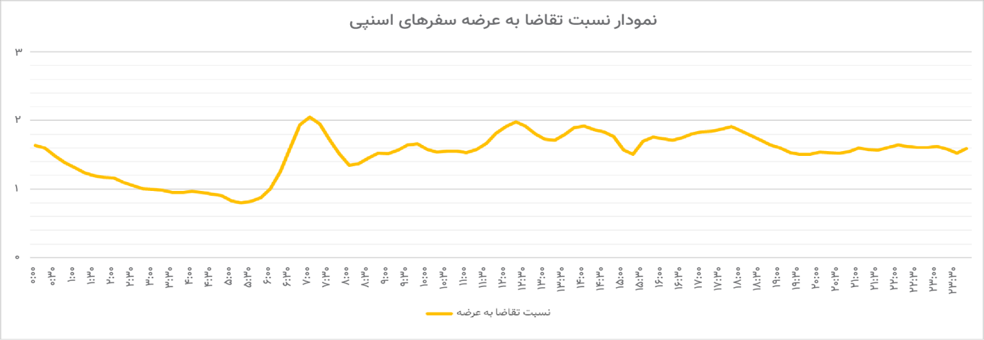 نمودار نسبت تقاضا به عرضه سفرهای اسنپ در ۱۰ شهر پرترافیک کشور که نشان میدهد بیشترین میزان تقاضا در ساعت ۷ صبح، ۱۲:۳۰ بعدازظهر و بازه زمانی ۱۶:۳۰ تا ۱۹ عصر ثبت شده است.