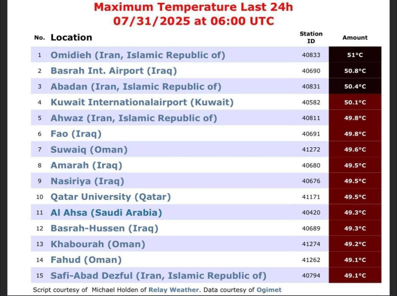 برترینها نوشت: طبق آخرین دادههای ثبتشده امروز (۹ مرداد ۱۴۰۴)، شهر امیدیه در استان خوزستان با دمای ۵۱ درجه سانتیگراد، عنوان داغترین نقطه کره زمین را در ۲۴ ساعت گذشته به خود اختصاص داد!