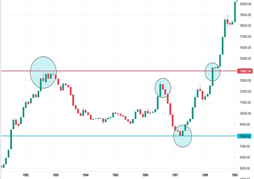 نمودار زیر تغییرات ماهانه شاخص کل را از سقف اولیه ۱۳۸۸۲ واحدی در مرداد ماه ۱۳۸۳ تا کف ۷۹۴۹ واحدی در فروردین ماه ۱۳۸۸ و نهایتاً فتح دوباره سقف اولیه با رسیدن به تراز ۱۳۸۹۴ واحدی در فروردین ۱۳۸۹ نشان میدهد.