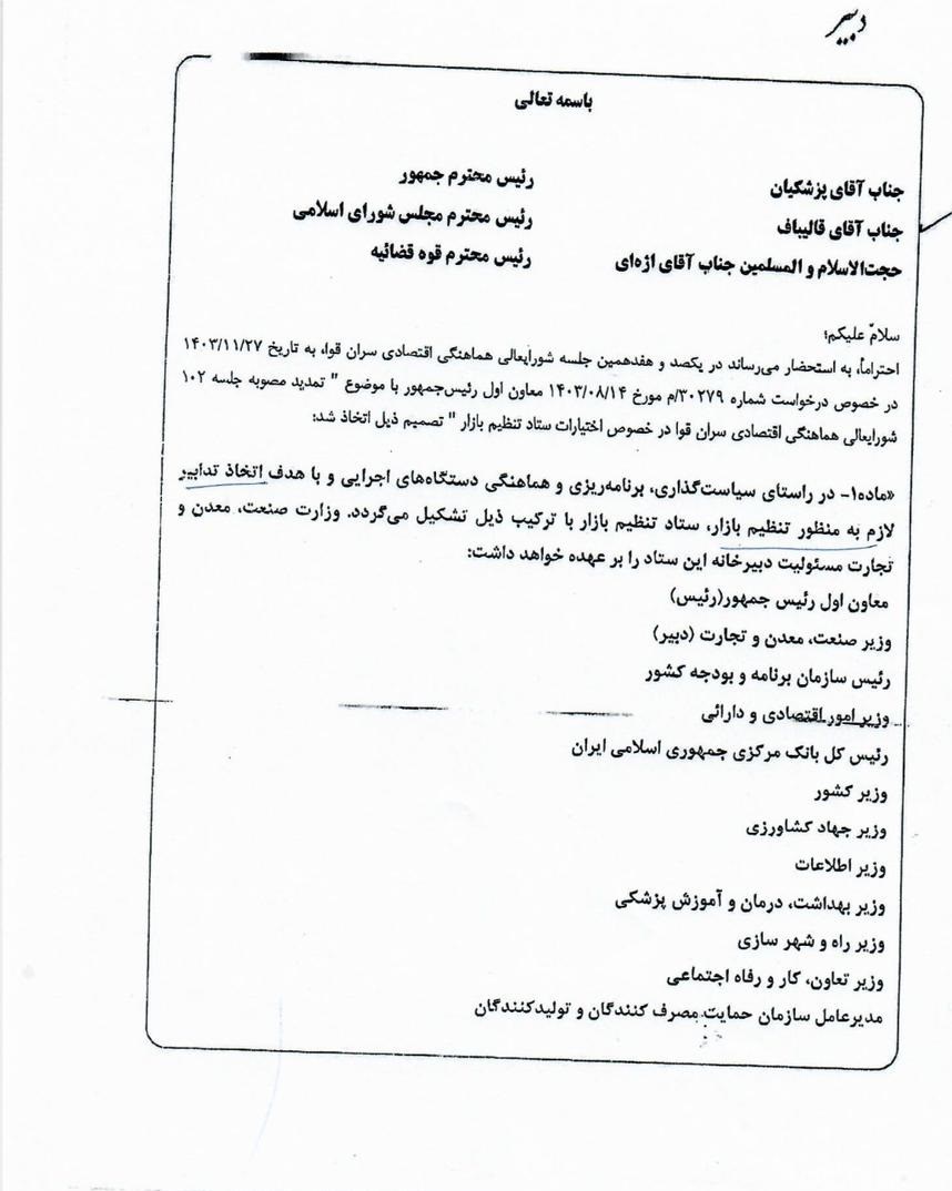 به گزارش تسنیم، اواخر بهمن ماه سال جاری، در یکصد و هفدهمین جلسه شورایعالی هماهنگی اقتصادی سران قوا به تاریخ 27 بهمن 1403 در خصوص درخواست شماره 30279/م تاریخ 14 آبان 1403 معاون اول رئیس جمهور با موضوع “تمدید مصوبه جلسه 102 شورای عالی هماهنگی اقتصادی سران قوا در خصوص اختیارات ستاد تنظیم بازار ” این شورا مصوب کرد که در راستای سیاستگذاری برنامهریزی و هماهنگی دستگاههای اجرایی و با هدف اتخاذ تدابیر لازم به منظور تنظیم بازار، ستاد تنظیم بازار با ترکیب معاون اول رئیس جمهور، وزیر صمت، رئیس سازمان برنامه و بودجه، وزیر اقتصاد، رئیس کل بانک مرکزی، وزیر کشور، وزیر جهاد کشاورزی، وزیر راه، وزیر اطلاعات، وزیر تعاون، رئیس سازمان حمایت و رئیس سازمان تعزیرات تشکیل شود که ناظر بر بازار و تنظیمگر این بازار باشد.