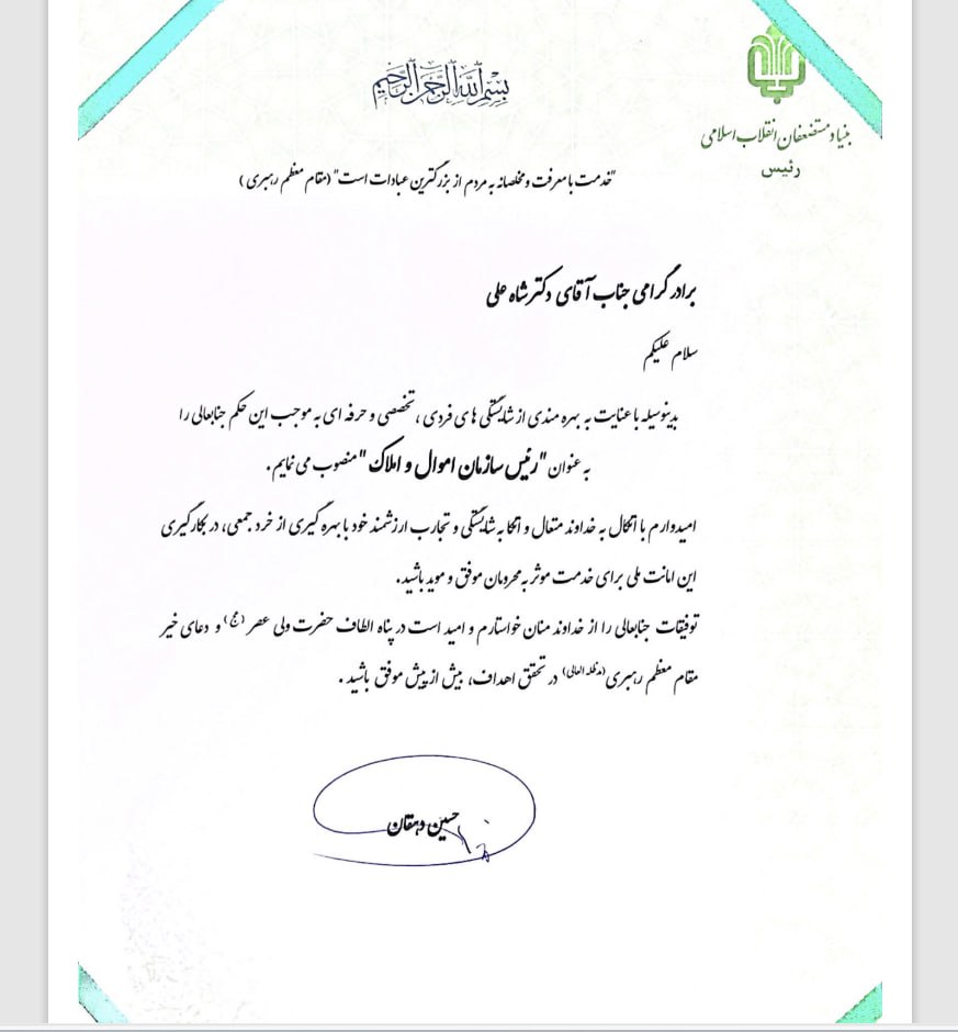 به گزارش الف در این حکم، بر شایستگیهای فردی، تخصصی و حرفهایشاهعلی از سوی حسین دهقان تاکید شده است.