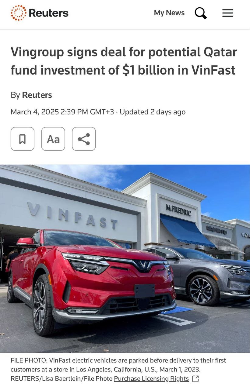 رویترز نوشت: شرکت ویتنامی وینگروپ (Vingroup) خبر از امضای توافق همکاری با صندوق سرمایهگذاری خصوصی JTA Investment Qatar داده است. بر اساس این توافق نامه شرکت قطری آماده سرمایهگذاری حداقل ۱ میلیارد دلاری در محصولات بزرگترین تولیدکننده خودروهای برقی ویتنام که حالا محصولاتش در بزرگترین نمایشگاههای خودروی دنیا حضور دارد و بازار خوبی در اروپا و آمریکا پیدا کرده است میشود. شرکت خودروسازی وینفست (VinFast)، در سالهای اخیر با تمرکز بر تولید خودروهای برقی به سرعت توانسته جایگاهی فراتر از این کشور شرق آسیایی و در هزاران کیلومتر دورتر از مرزهای سرزمینیاش پیدا کند.