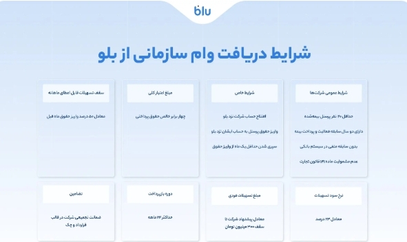 هر شرکتی که حداقل ۲۰ پرسنل داشته باشد میتواند از بلو وام سازمانی دریافت کند. مسیر همکاری با طی کردن مراحل زیر به جریان میافتد: