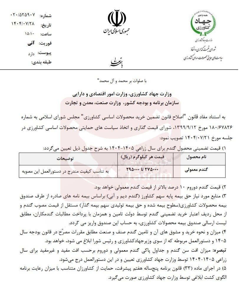 طبق قانون، قیمت خرید تضمینی گندم پس از تصویب در شورای قیمتگذاری باید توسط وزیر جهاد کشاورزی اعلام شود.