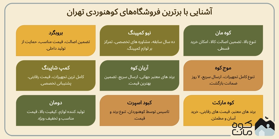 فروشگاههایی مانند کوه مان، نیو کمپ، بروبگرد، موج کوه، آریان کوه، کمپ شاپینگ، کوه مارکت، کبود اسپرت و دومان از معتبرترین فروشگاههای لوازم کوهنوردی در تهران هستند که محصولات متنوع و باکیفیت عرضه میکنند.