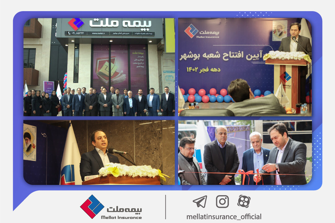 به گزارش روابط عمومی بیمه ملت، شعبه جدید این شرکت در استان بوشهر با حضور علی‌رضا یزدان‌دوست مدیرعامل، داود قاسم‌پور رئیس و محمدتقی چراغی نائب رئیس هیئت مدیره و برخی از معاونان و مدیران شرکت بیمه ملت و مسئولان محلی این استان به صورت رسمی افتتاح و آغاز به کار کرد.