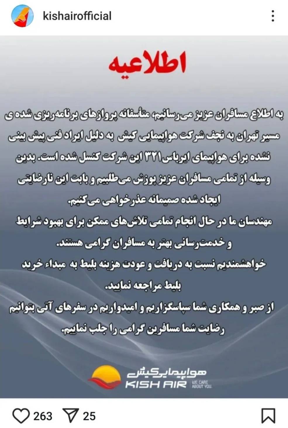«در پروازهای هواپیمایی کیش حفظ امنیت و سلامت مسافران از مهمترین اولویتهای این شرکت است. متاسفانه بهرغم پیشبینی انجام پروازهای تهران- نجف از مبداء فرودگاه حضرت امام خمینی (ره) به دلیل وقوع ایراد فنی ناگهانی برای یکی از هواپیماهای این شرکت و لزوم تعیین قطعه و زمانبر بودن این پروسه و امکان به خطر افتادن ایمنی پروازها، کیش ایر ناچار به لغو پروازهای تهران- نجف و بالعکس شده است.